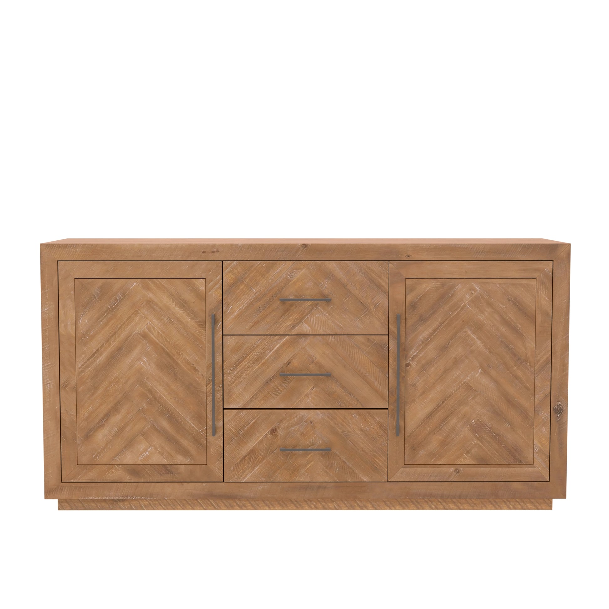 The Aiden sideboard adds a prominent design touch to your dining room. Featuring Pine solids and a Natural Weathered (Brown) finish, this beautiful piece provides function and storage. The front of the sideboard features an inlaid chevron pattern. Brass hardware pulls accent the 2 cabinet doors and 3 drawers. As an individual item, or correlated with the matching dining room, this piece is ideal for any home. Coordinates with other pieces from the Alpine Furniture Aiden dining group.