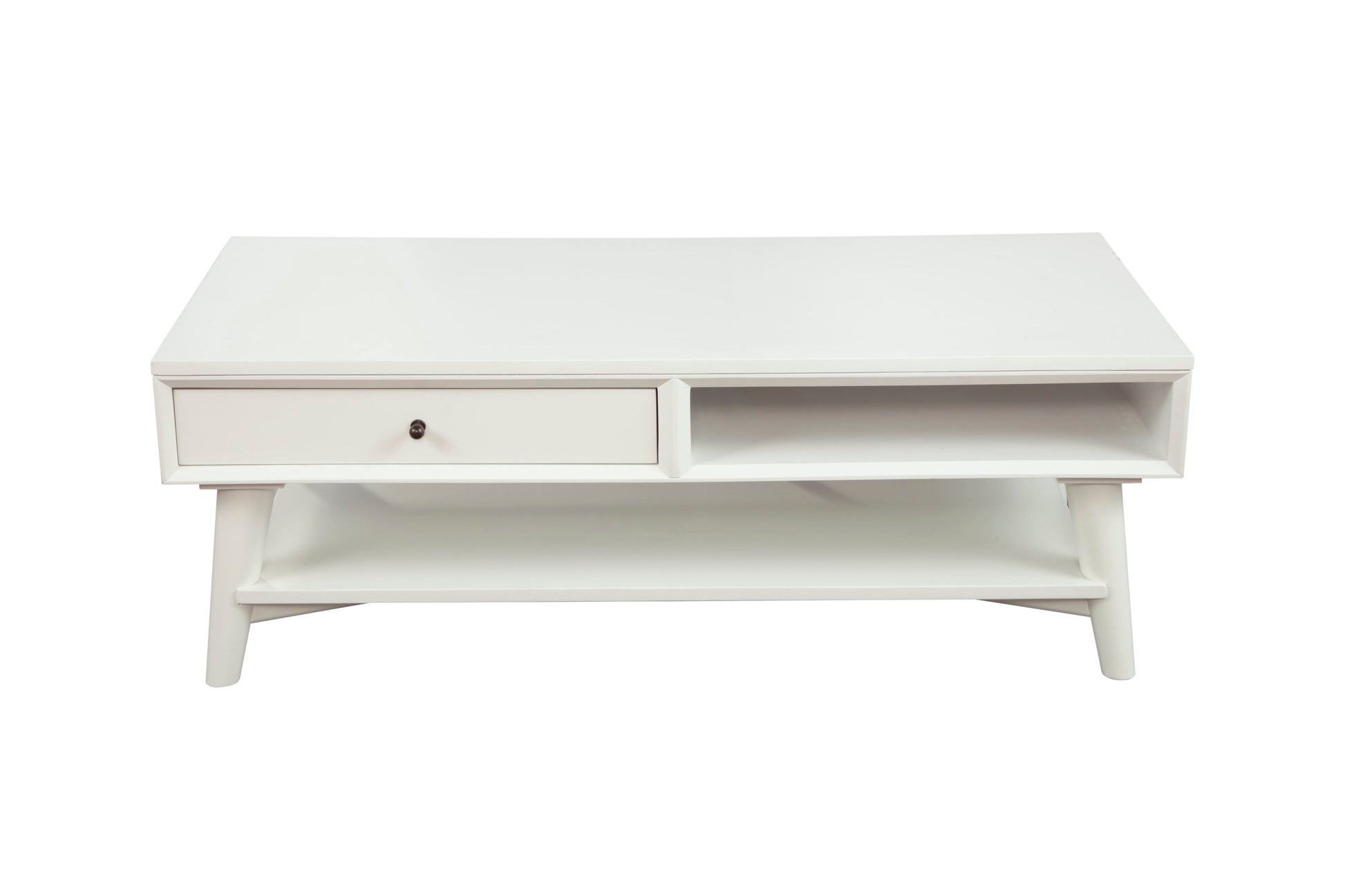 Lend your living room layout a little Mid-Century modern flair with this clean-lined piece. Found atop four splayed legs, the Flynn cocktail table is crafted from Mahogany wood solids and Okume veneer. The felt lined drawer offers out-of-sight storage for odds and ends while the rectangular top provides a place to spread out snacks, magazines, and more. The drawer is on a 2-way slide allowing easy access from either side of the table and there is an open shelf for additional storage. The white finish is versatile enough to complement most color palettes. Mix and match with other pieces from the Alpine Furniture Flynn collection.