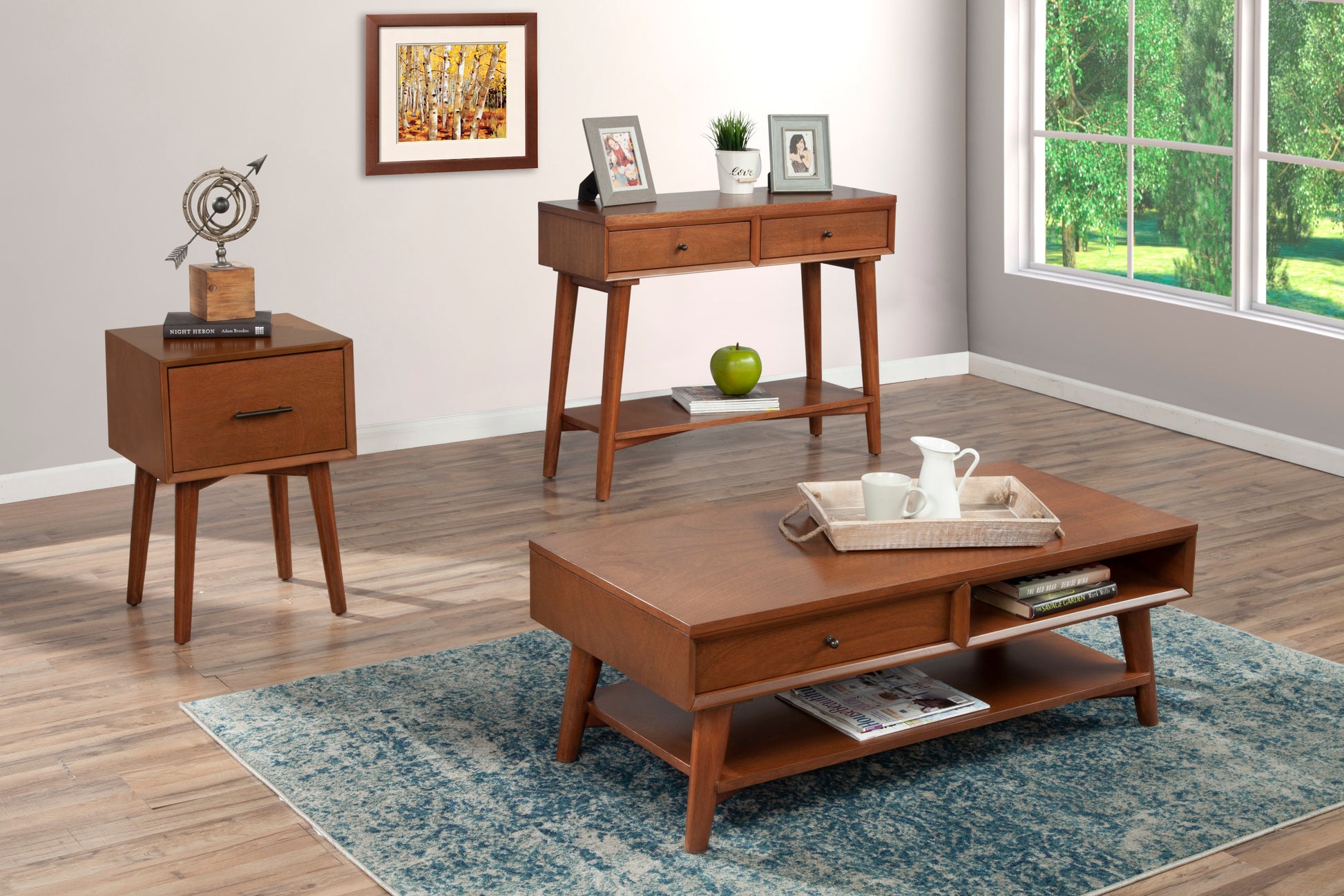Lean over and grab your book or remote from the convenience of your sofa with the Flynn end table. Brimming with Mid-Century modern appeal, this piece is designed from Mahogany wod solids and Okume veneer and features clean-lines that work perfectly with contemporary spaces. Sleek, tapered legs add an understated look, while a spacious surface top is ideal for a stylish lamp or table clock. The storage drawer is felt lined. Available in a warm Cherry Acorn (Brown) finish. Mix and match with other pieces from the Alpine Furniture Flynn collection.