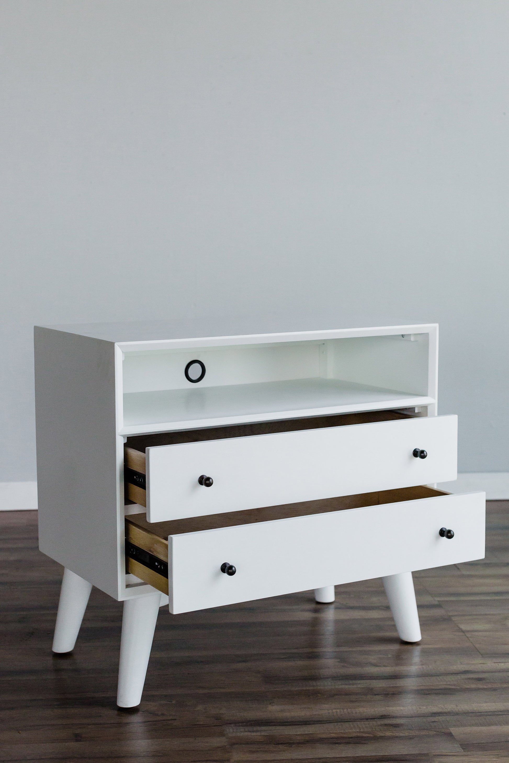 Always on their side, nightstands are every bed’s best friend. For fans of Mid-Century Modern design, the Flynn White Grand Nightstand is your best friend too! Built from sustainably sourced Mahogany solids and veneers, this piece sports a clean, sharp-angled silhouette with iconic splayed legs below. Coordinates with other pieces from the Alpine Furniture Flynn collection.