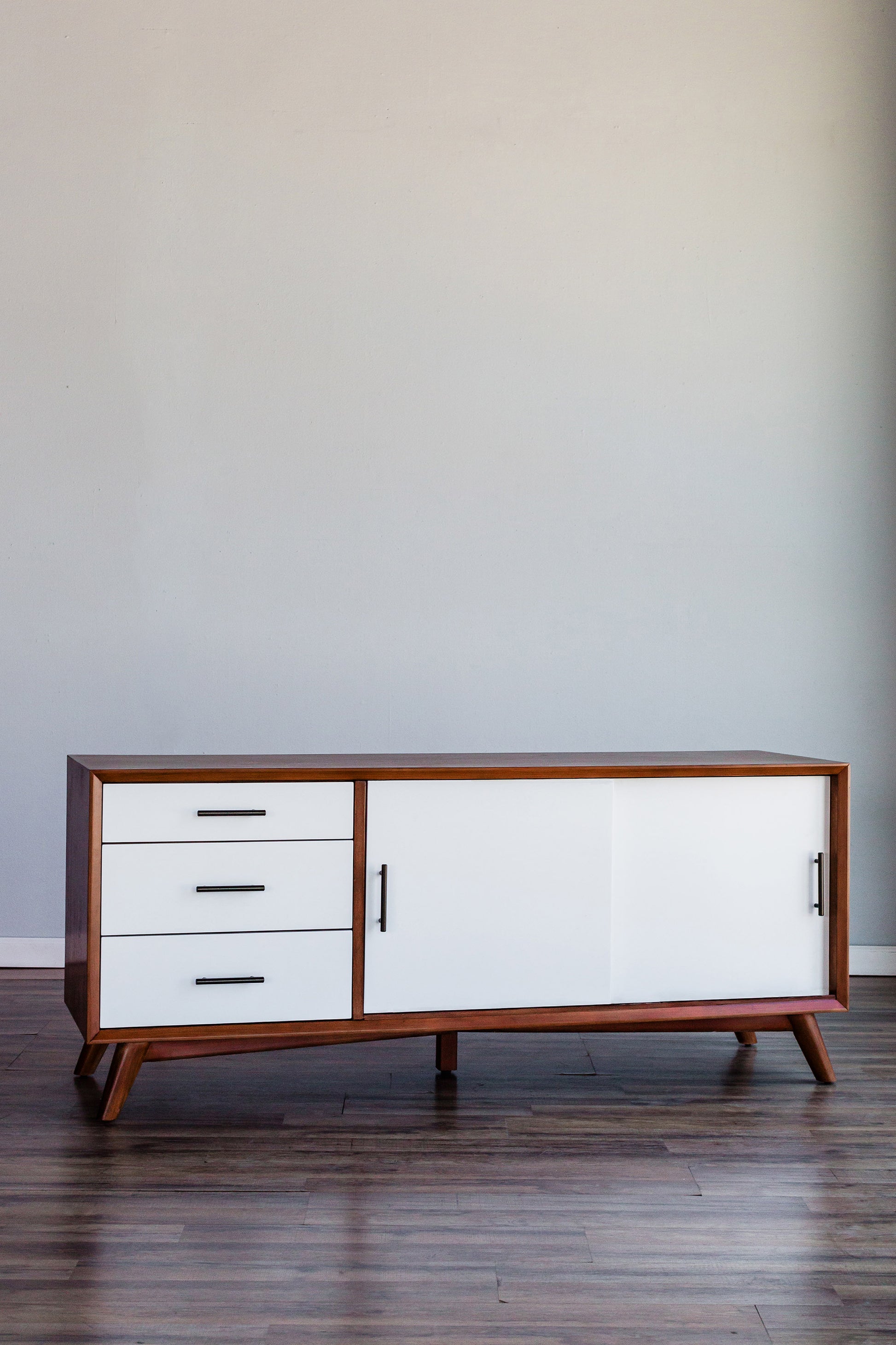 The Flynn collection features the classic lines of Mid-Century Modern furniture that never goes out of style. Its sturdy frames are built to last, constructed of sustainably sourced solid Mahogany wood and Veneer to ensure a lifetime of use. The TV console provide a roomy storage solution featuring 3 drawers and media cabinets with rolling doors to hold your valuables and electronic devices. Drawers are made with English Dovetail construction and ball bearing metal drawer glides. The Flynn collection makes it easy to create a cohesive decorating style or mix and match for a more personalized look. Available in a beautiful two-tone Acorn (Brown)/White, Acorn (Brown) or all White finish.