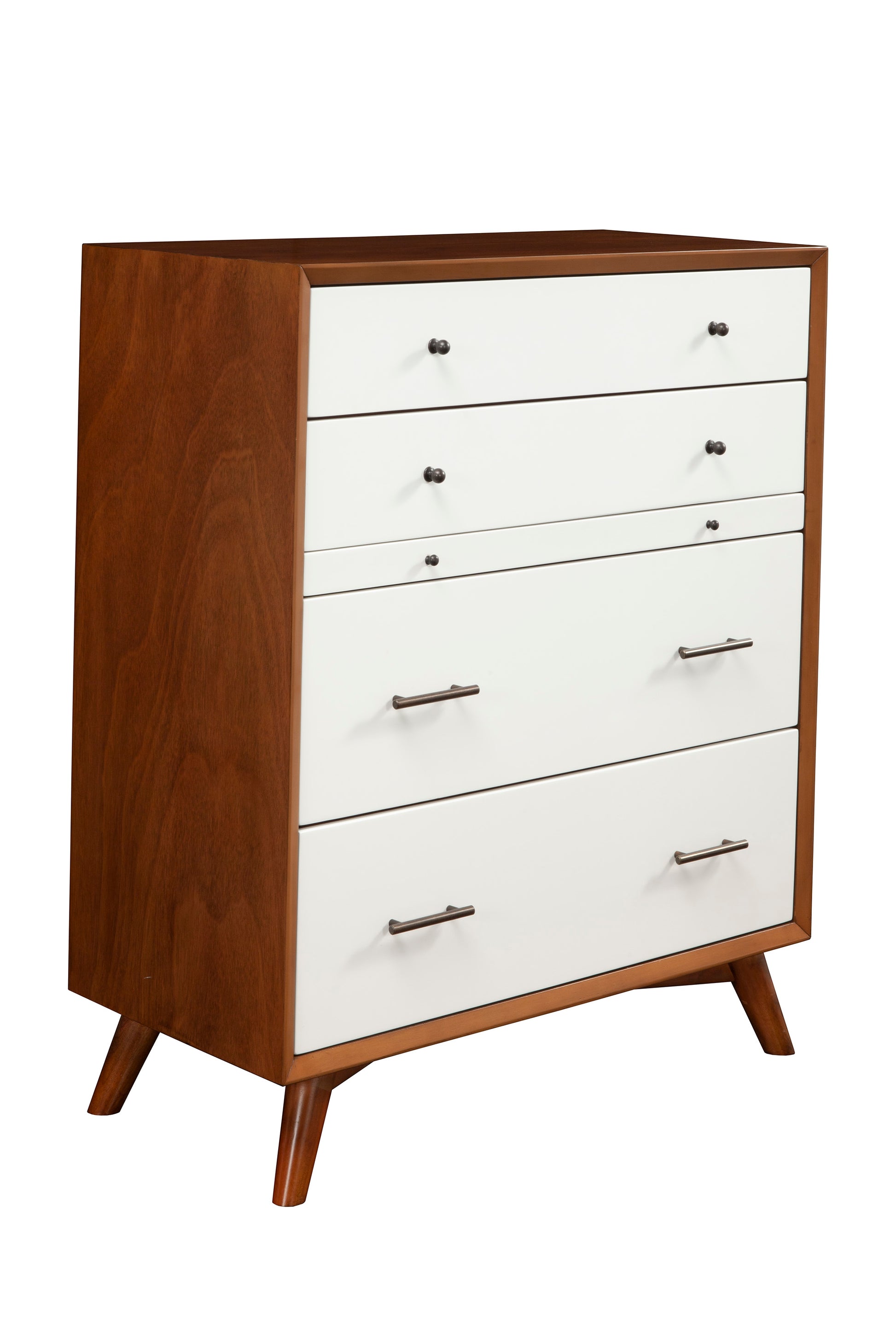 Flynn Mid Century Modern 4 Drawer Two Tone Multifunction Chest w/Pull Out Tray, Chestnut/White