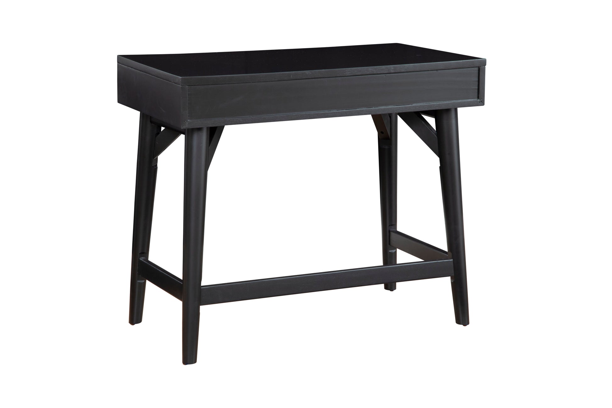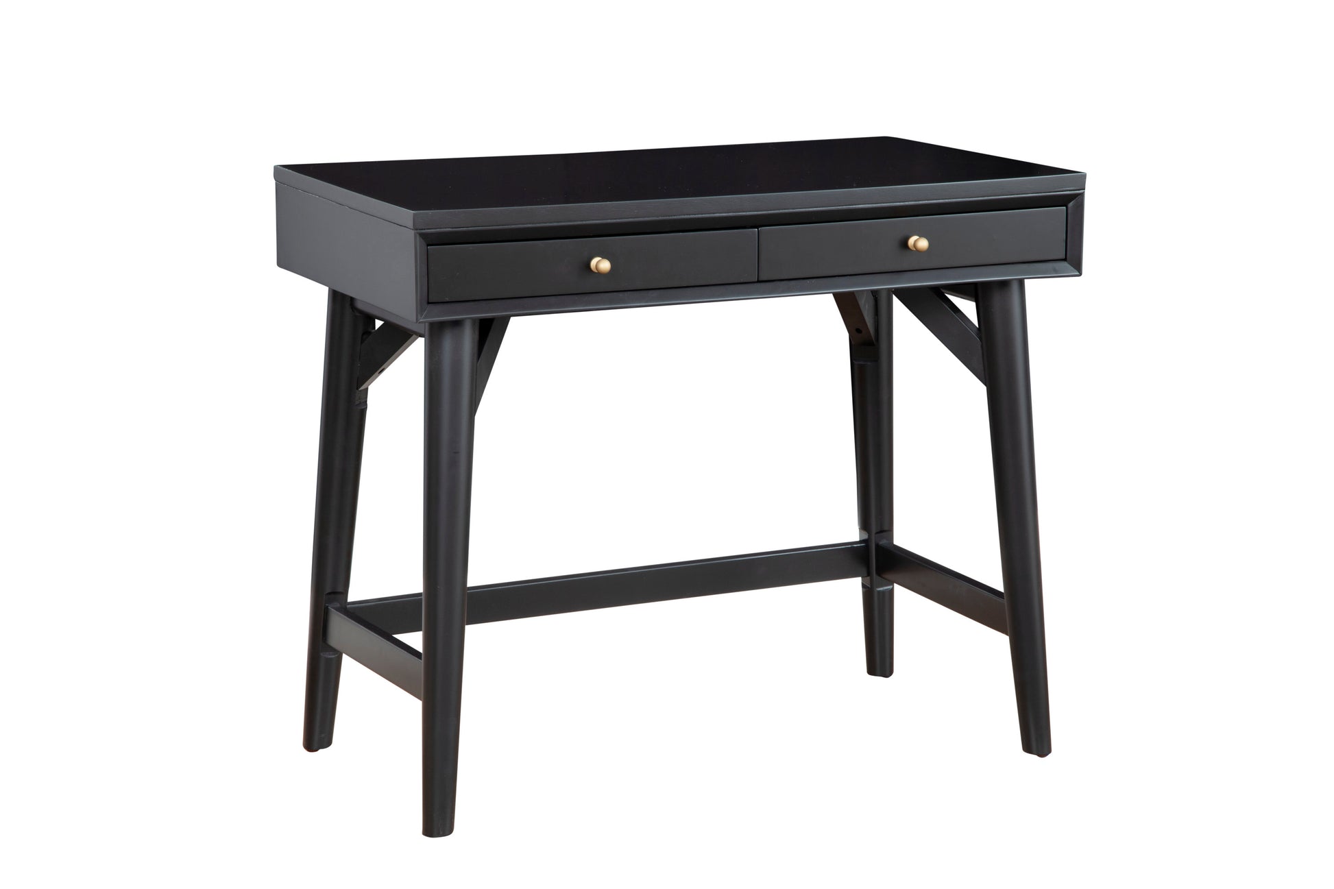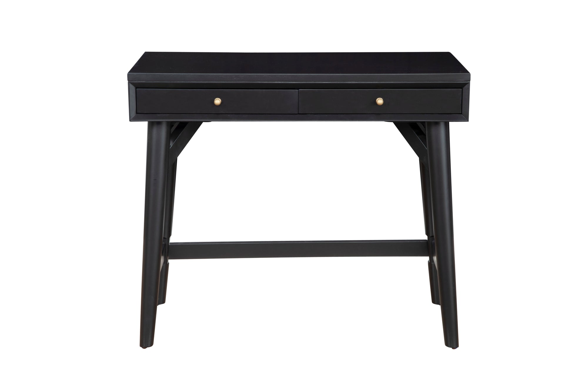 Influenced by Mid-Century design, the Flynn 2-Drawer Desk combines clean-lines and tapered legs for a distinctive look. Featuring Mahogany wood solids and veneer, use this piece to anchor your home office in sophisticated style. Finished in a timeless black, the drawers are felt lined and have accent hardware. Mix and match with other pieces from the Alpine Furniture Flynn collection.