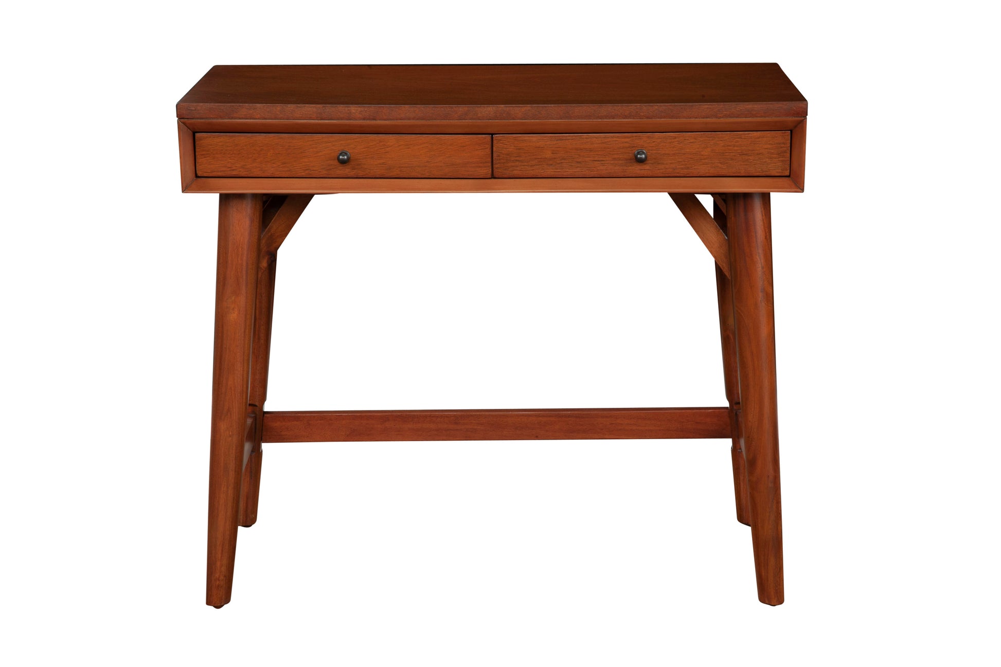 Influenced by Mid-Century design, the Flynn 2-Drawer Desk combines clean-lines and tapered legs for a distinctive look. Featuring Mahogany wood solids and Okume veneer, use this piece to anchor your home office in sophisticated style. Finished in a warm Cherry Acorn (Brown), the drawers are felt lined and have accent hardware. Mix and match with other pieces from the Alpine Furniture Flynn collection.