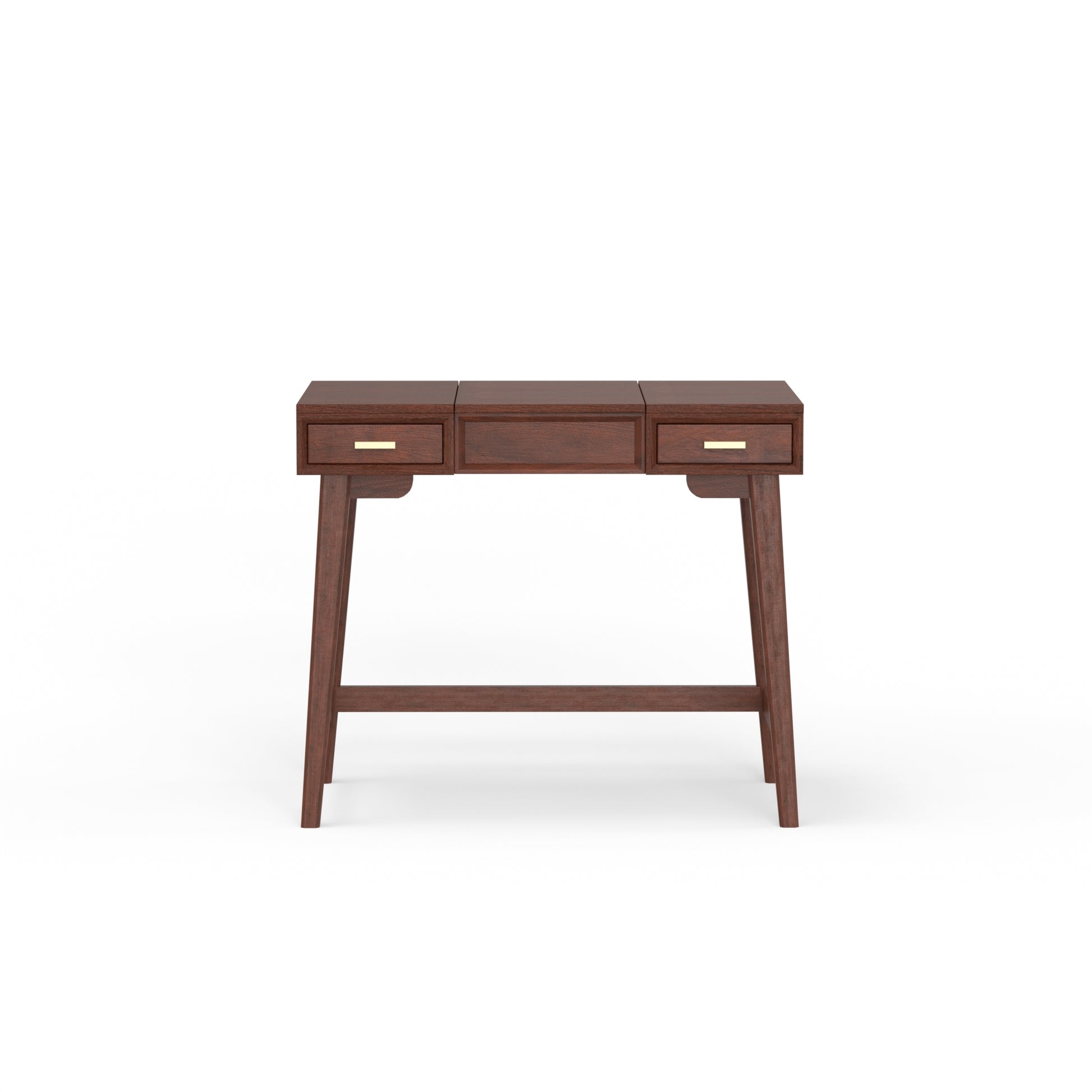 The streamlined design of the Gramercy mid-century bedroom vanity is compact, with a retractable mirror for a variety of makeup or jewelry functionality . Simplify your morning routine, retract the top of this vanity table to reveal a beautiful mirror and a selection of organized felt lined compartments, making everything available when you need it. When you’re finished, fold it back down to use it as a desk when its time to get some work done. Made of durable Mahogany wood solids and veneer, this bedroom vanity will adorn your home for years to come. Light assembly required. Coordinate with other pieces from the Gramercy bedroom collection.